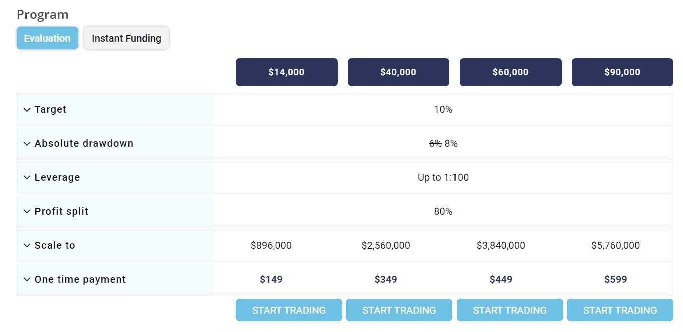 There is no longer a minimum trading days requirement for their programs which is a big plus. As soon as a trader hits their milestone target, they become eligible for a payout and additional funding responsibility