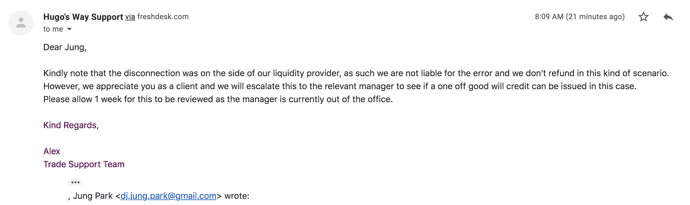 If you read this hugosway, consider paying your customer the respect they deserve, reputation is everything in this game. Imagine how much customers will look for another broker after reading this comment, a unhappy customer can have a huge effect these days with all the medias and shit.