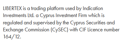 Libertex is a brand name that is used by Indication Investment Ltd, a Cyprus established Investment Firm, which is regulated and supervised by the Cyprus Securities and Exchange Commission (CySEC) and is considered a low-risk forex broker.