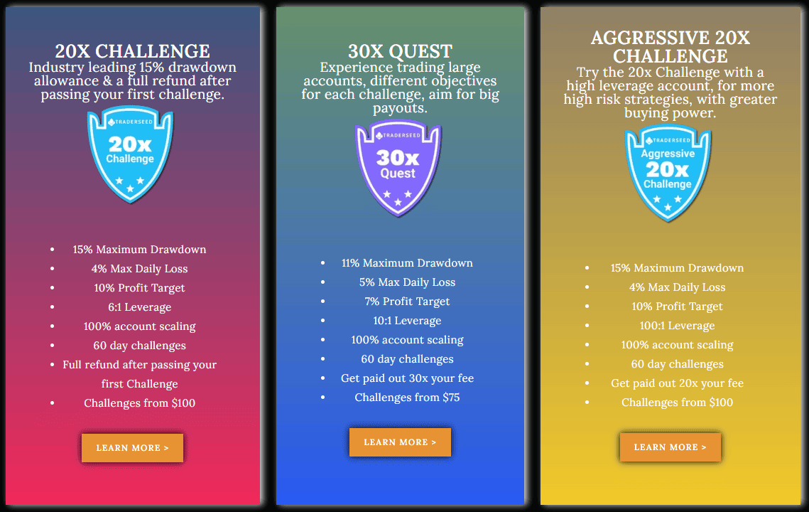 - TraderSeed offers three main challenges: the 20X Challenge, the 30X Quest, and the Aggressive 20X Challenge, each tailored to different levels of trader experience and risk tolerance. These challenges include features like industry-leading maximum loss limits, sensible leverage, the opportunity to trade large account sizes, and personalized support throughout the trading journey.